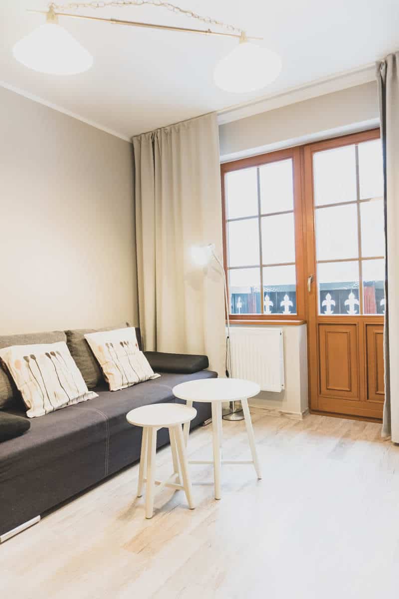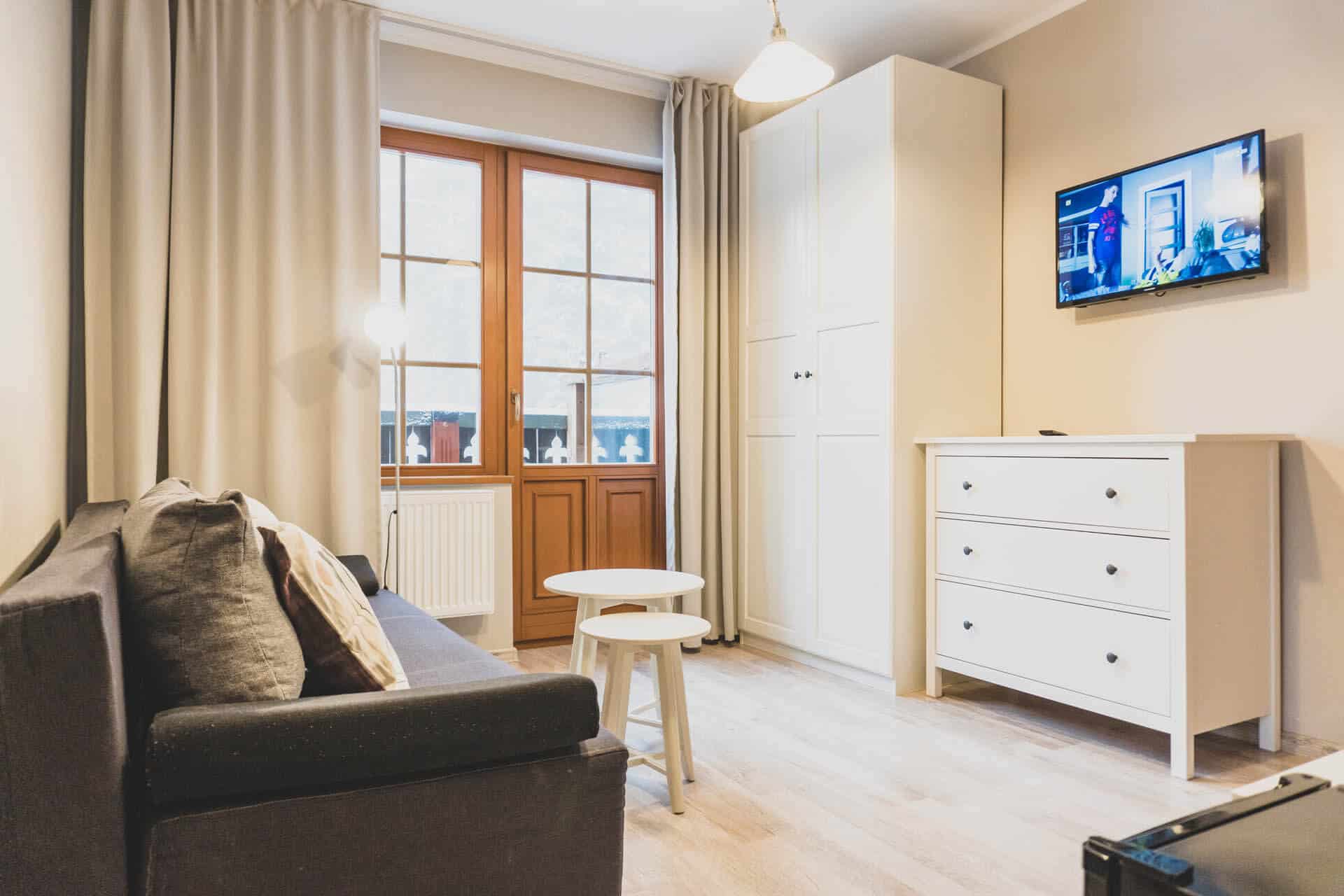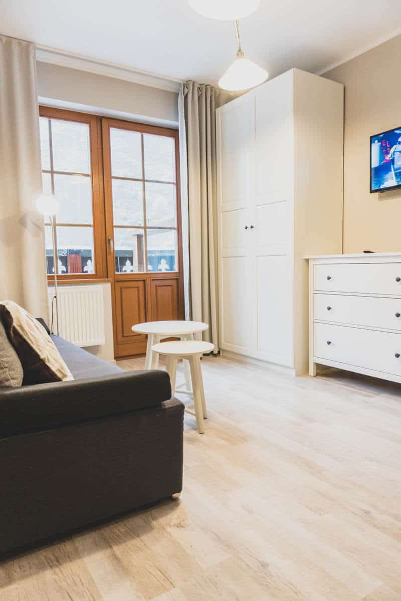 - 4 osobowy- położony na pierwszym pietrze- dwupokojowy ( pokój z trzeba pojedynczymi łóżkami oraz pokój z rozkładaną kanapa)- balkon- łazienka- tv- czajnik- lodówka